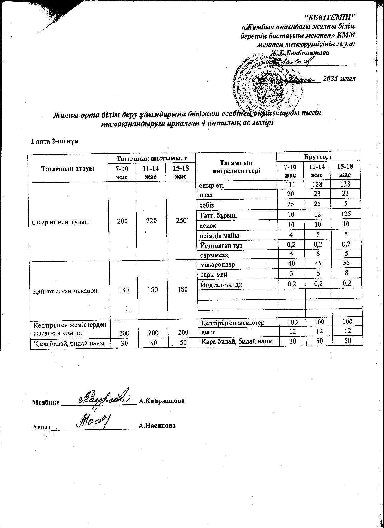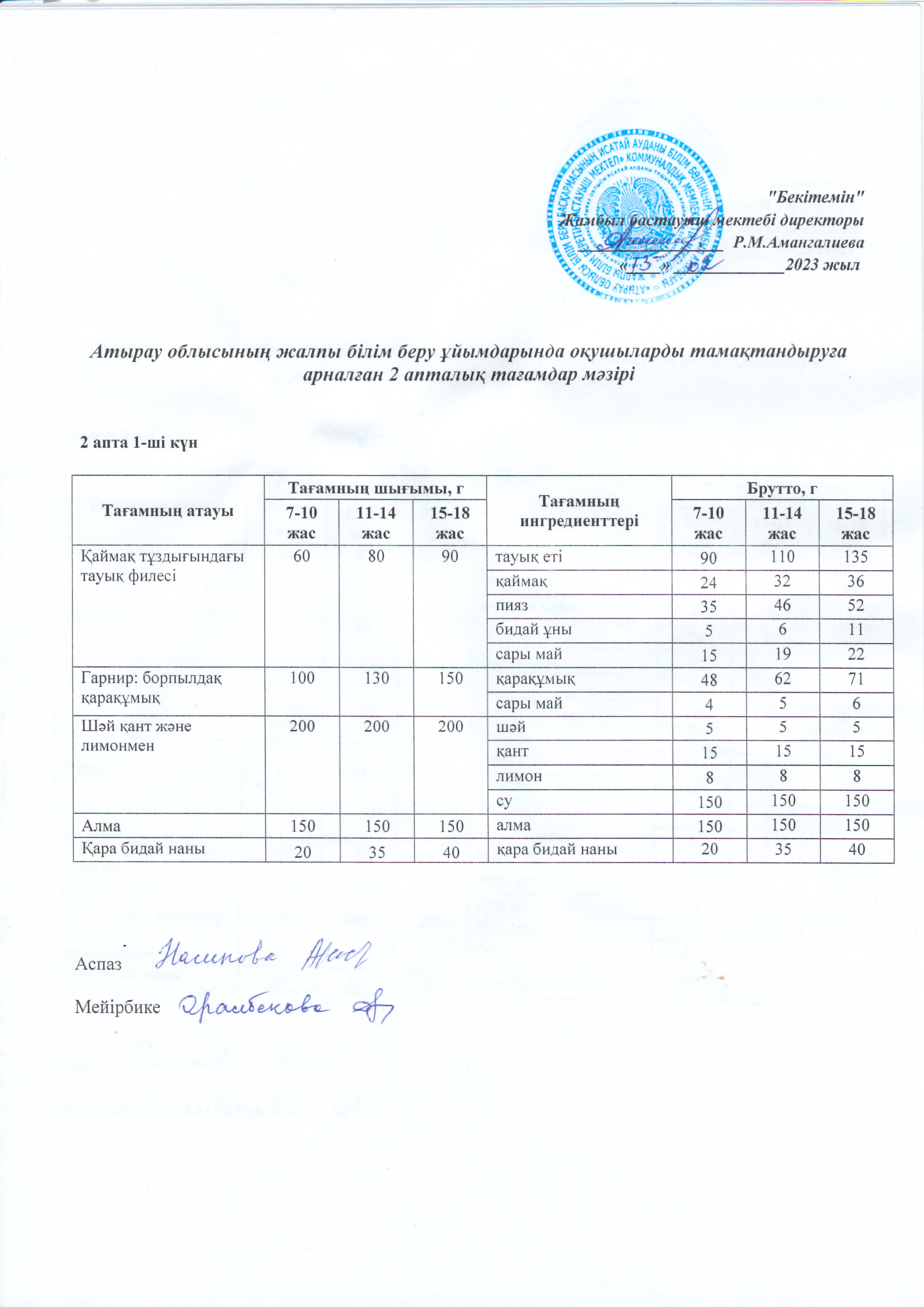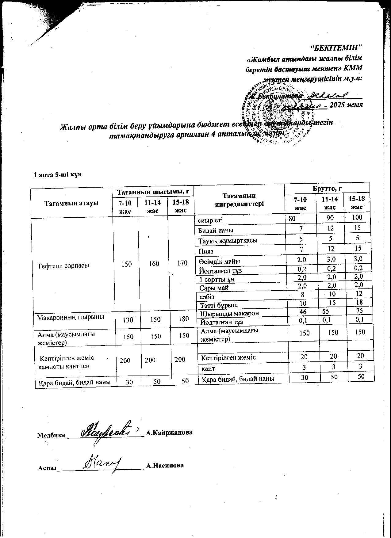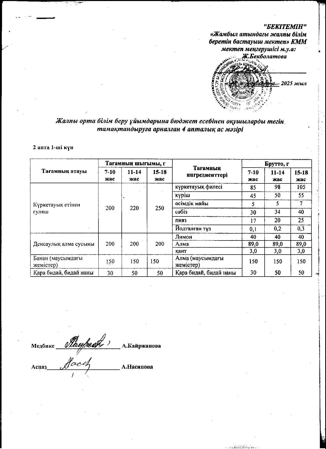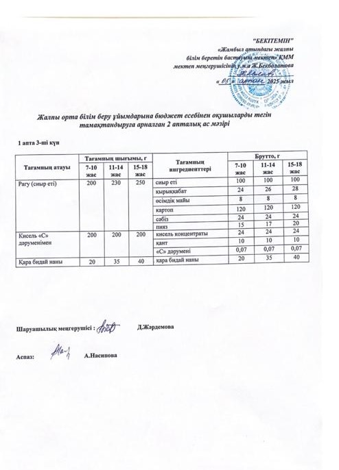 | 1 | Аз қамтылған жанұядан шыққан және 1-4 сынып оқушыларына арналған 2021 жылдың 2 апталық ас мәзірі |