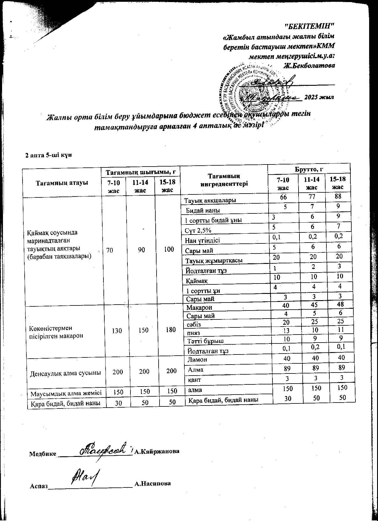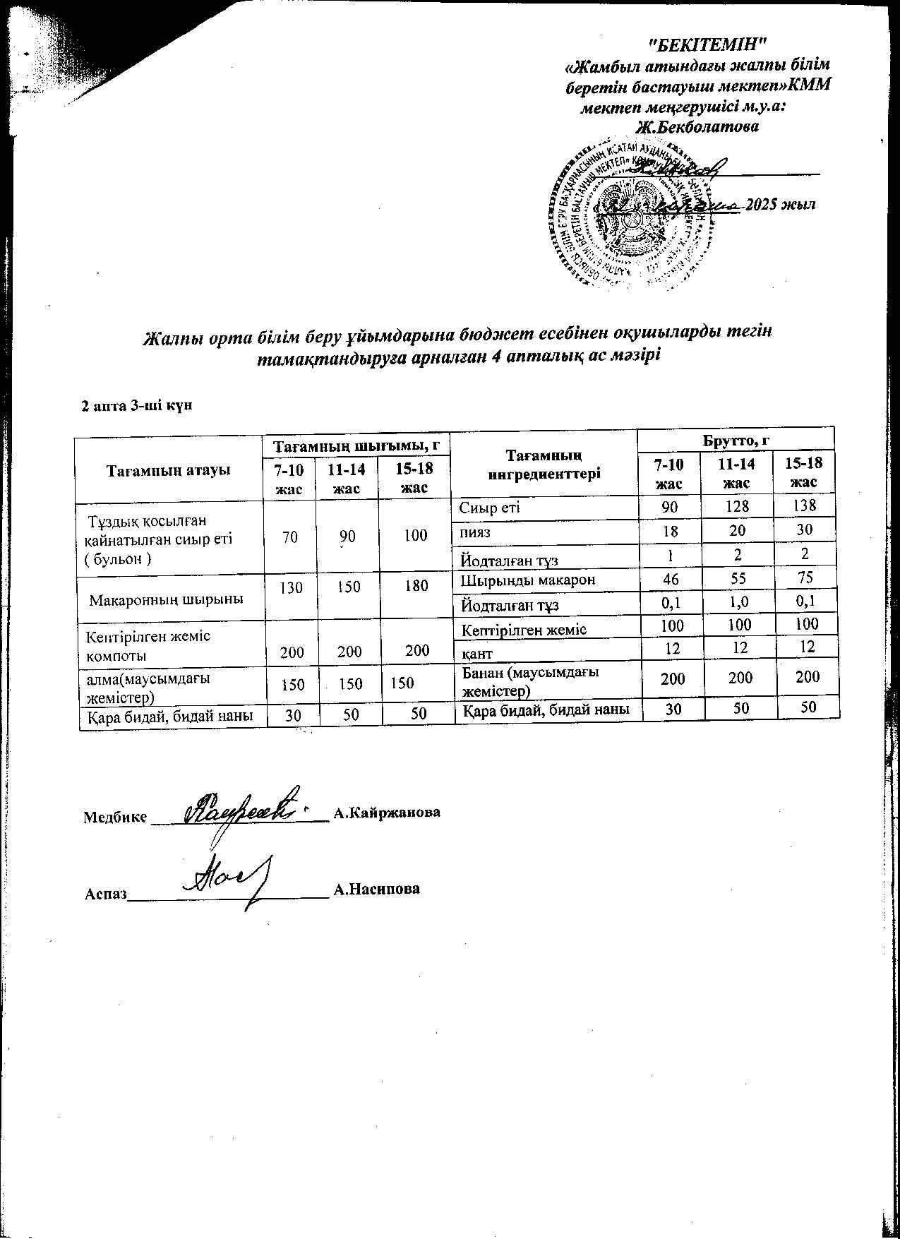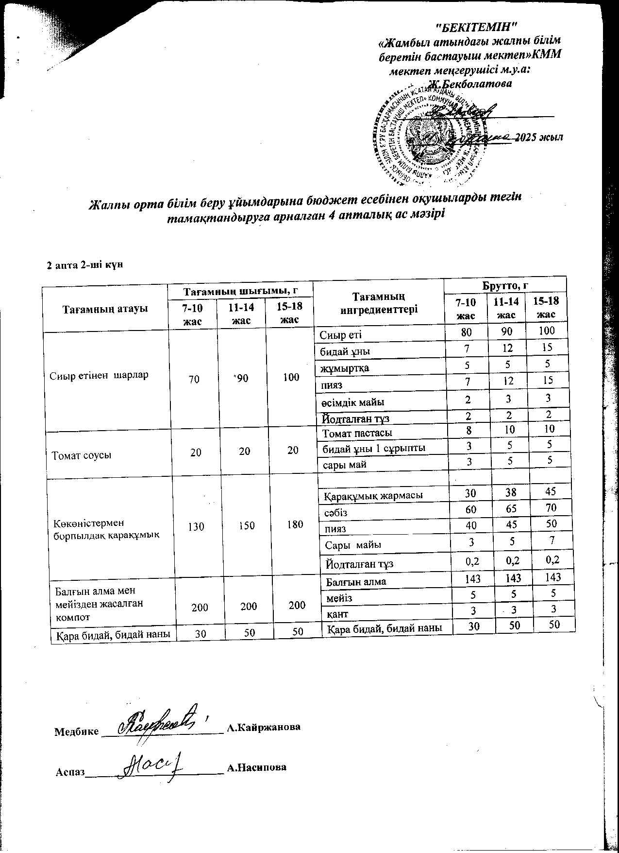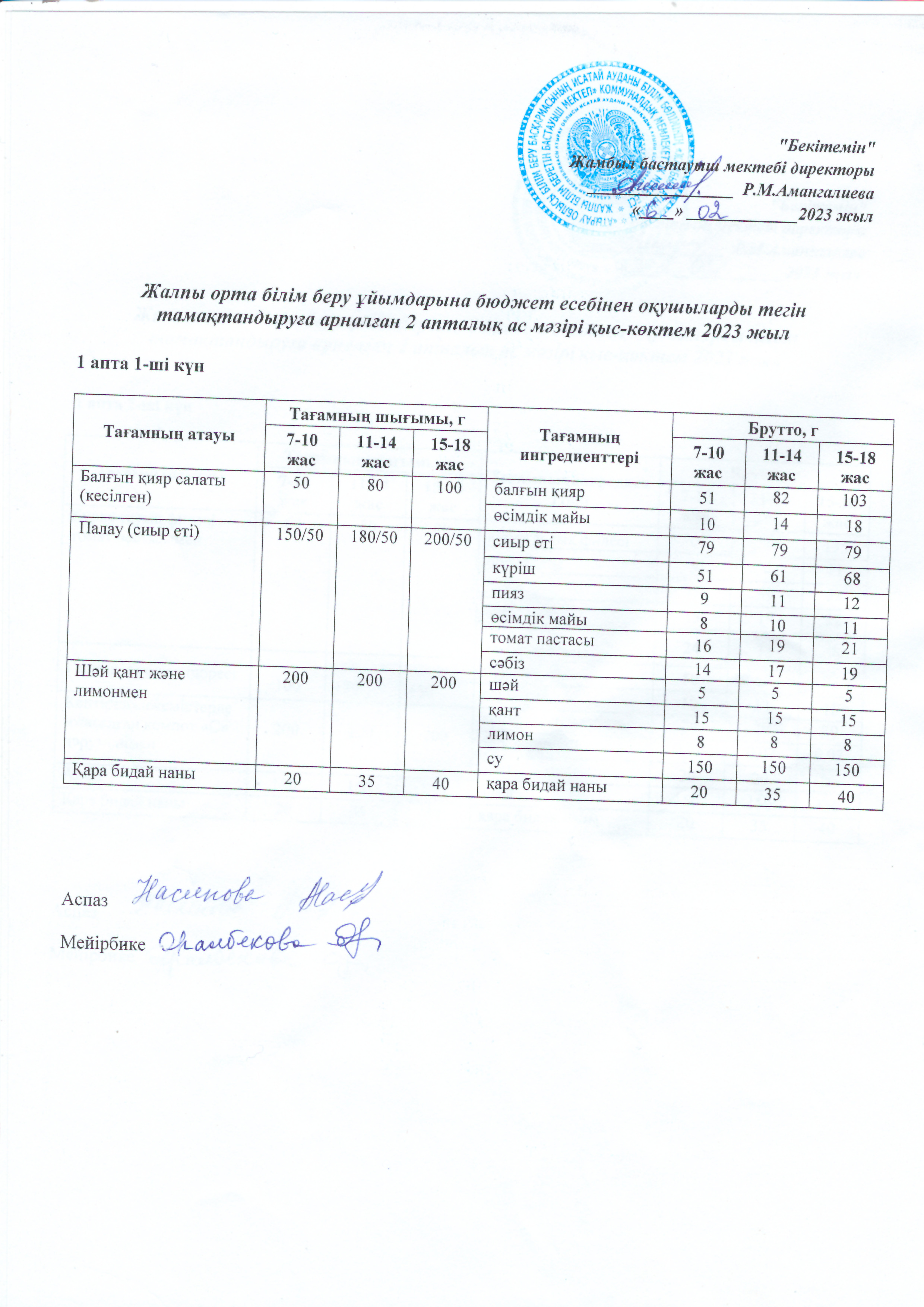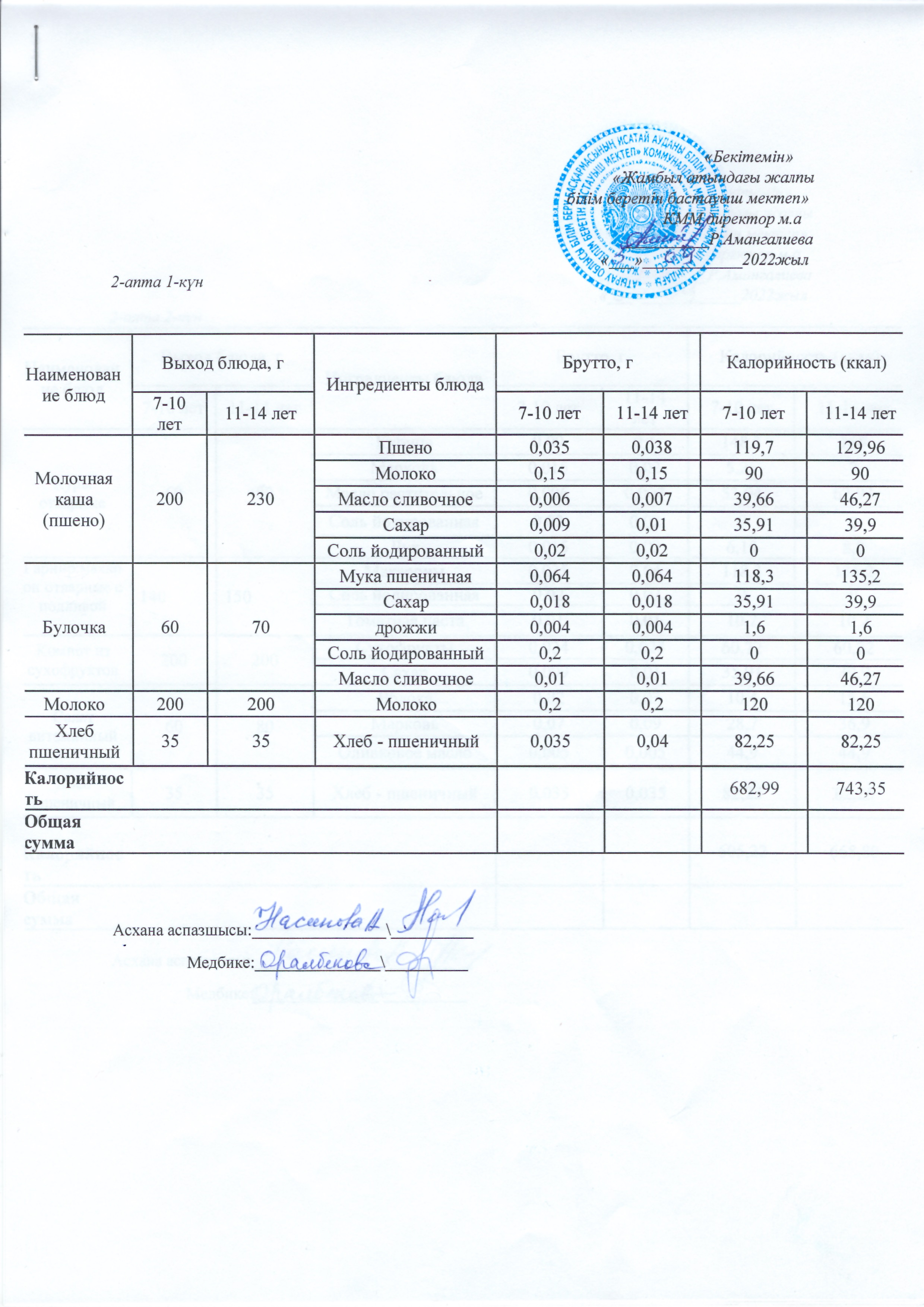 | 1 | Аз қамтылған жанұядан шыққан және 1-4 сынып оқушыларына арналған 2021 жылдың 2 апталық ас мәзірі |