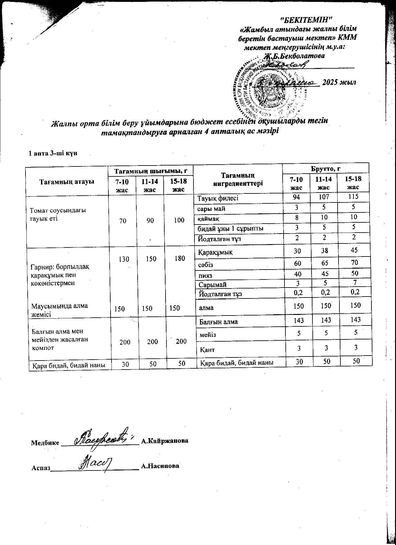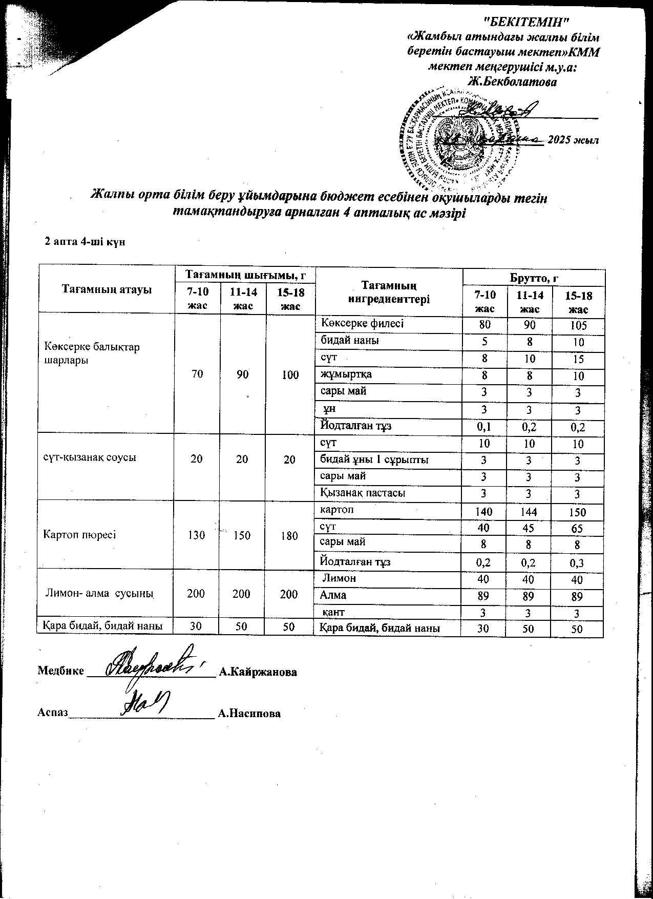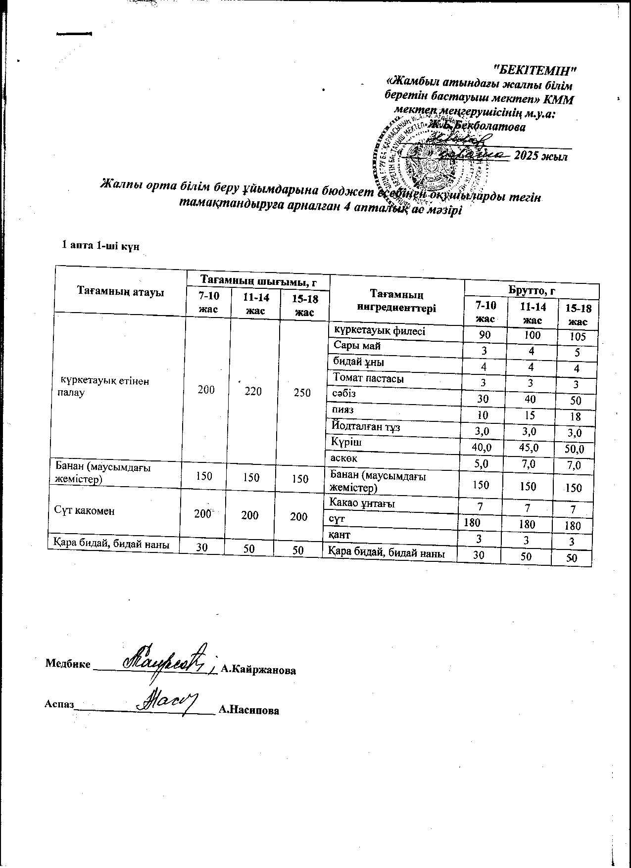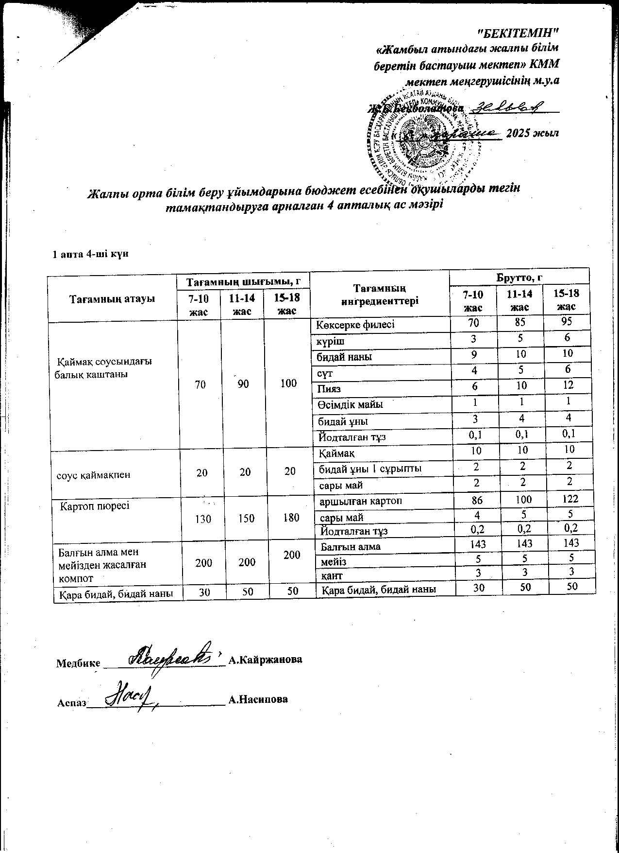 | 1 | Аз қамтылған жанұядан шыққан және 1-4 сынып оқушыларына арналған 2021 жылдың 2 апталық ас мәзірі |