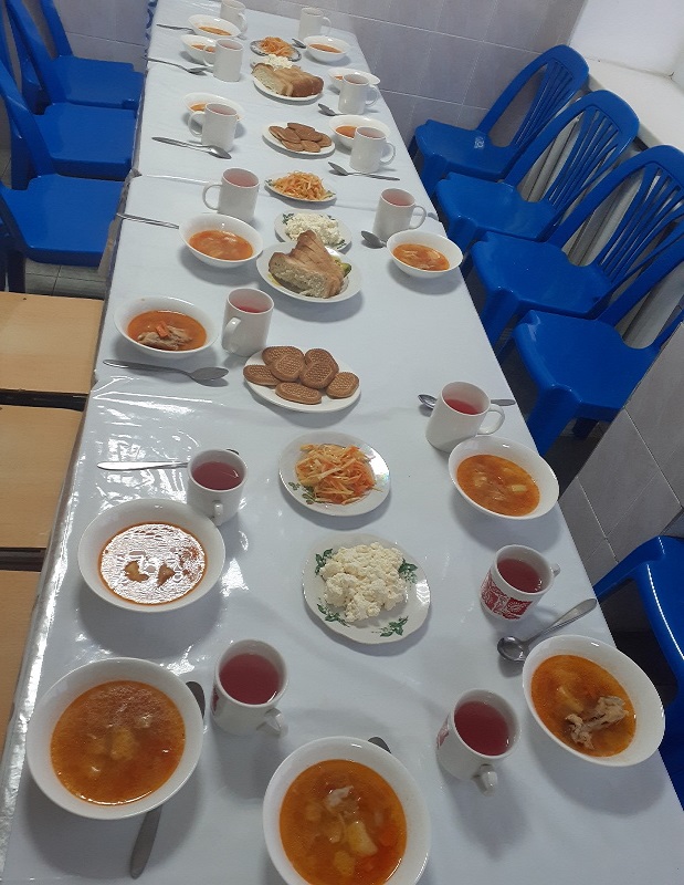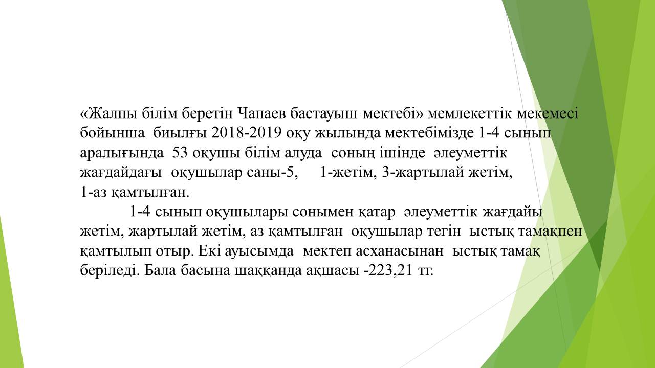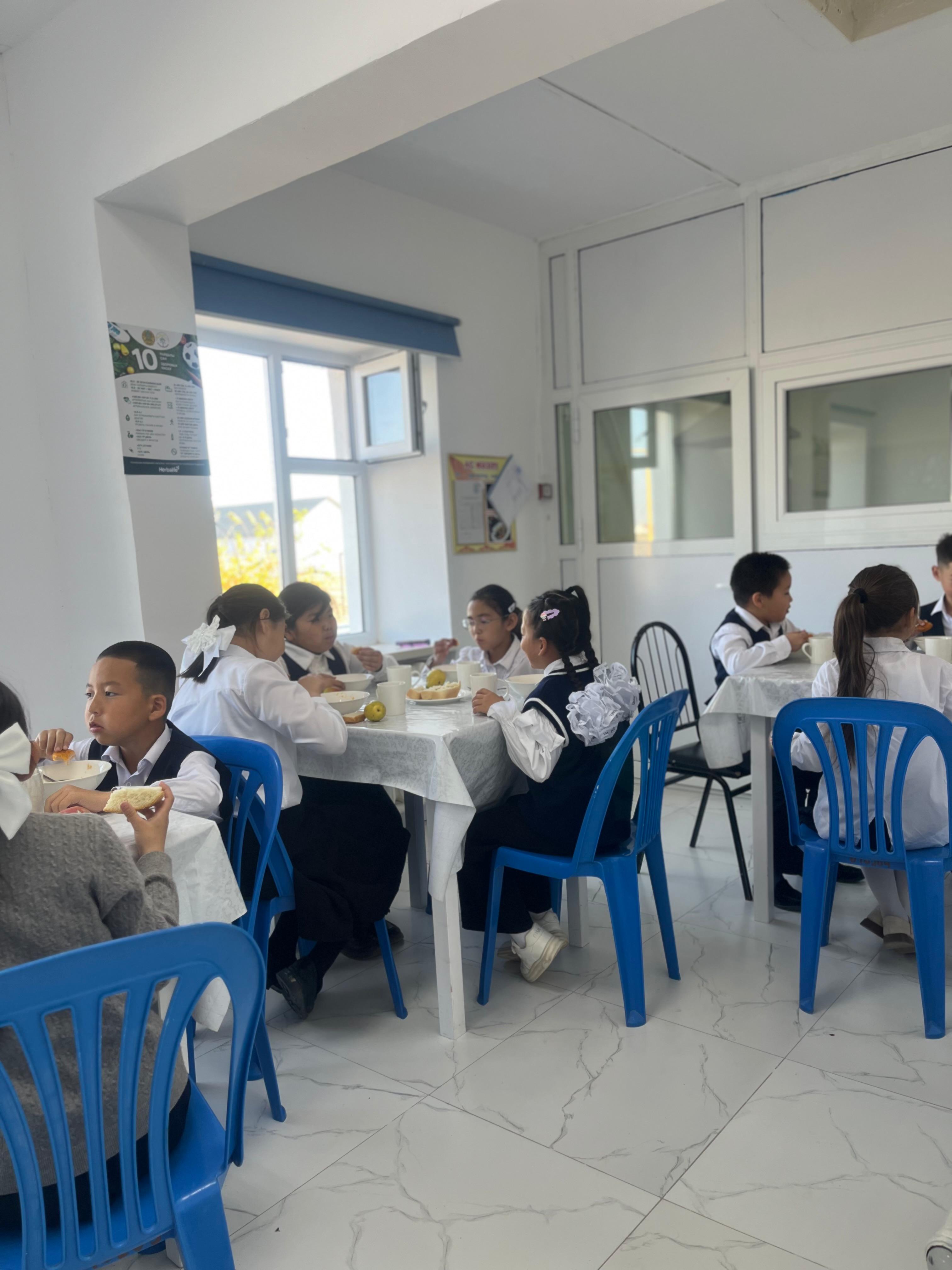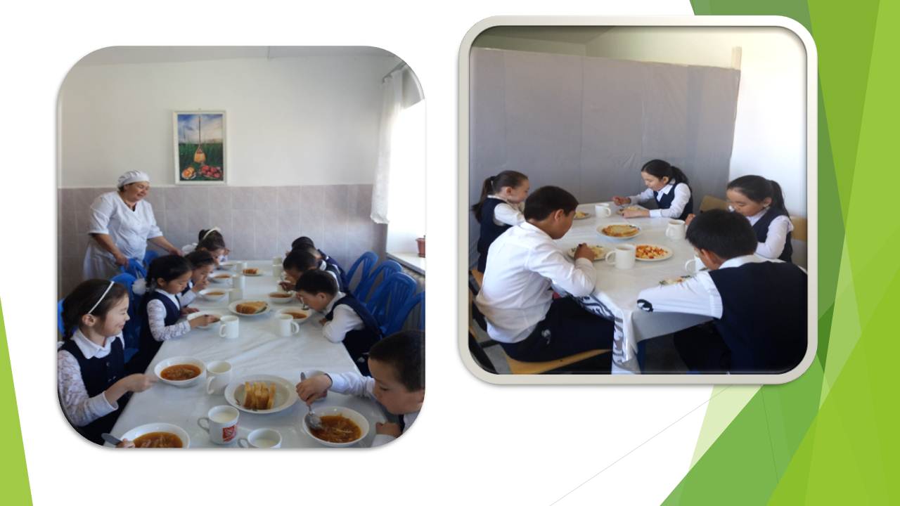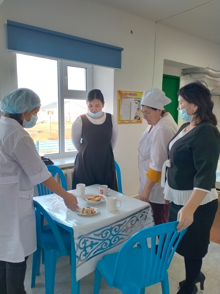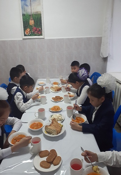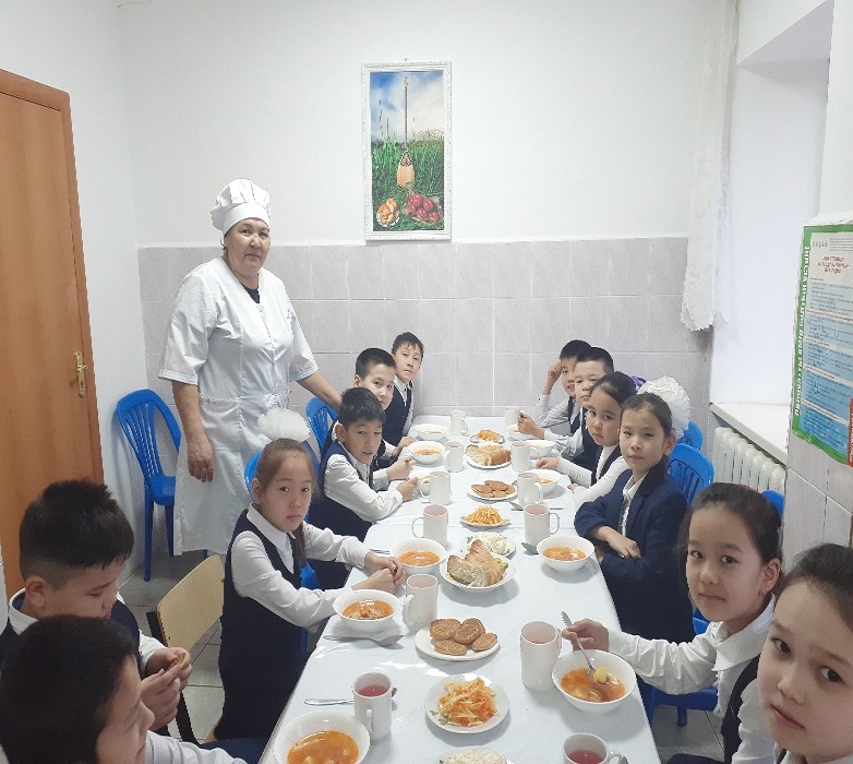 Биылғы 2019-2020 оқу жылында мектебімізде 1-4 сынып аралығында 54 оқушы, мектепке дейінгі топтарда 15 тәрбиеленуші тәрбиеленіп білім алуда. Жалпы саны 69 1-4 сынып оқушылары соны мен қатар әлеуметтік жағдайы жетім, жартылай жетім , аз қамтылған оқушылар тегін ыстық тамақпен қамтылып отыр. Екі ауысымда мектеп асханасынан ыстық тамақ беріледі. І-кезеңде – 27 оқушы (оның төртеуі әлеуметтік жағдайдағы балалар) ІІ - кезеңде - 27 оқушы (оның алтауы әлеуметтік жағдайдағы балалар) Мектеп асханасына жеке кәсіпкер ИП «Жанель» Нурғалиев Бауыржан тағамның уақытында келуін, азық-түлік өнімдерін тасымалдау үшін Toyota Hilux Pick-up- 489KFA06 автокөлігімен қамтамасыз етіледі. Асхана аспазшысы Насипова Алма медициналық тексеруден толық өткен. Асханада күнделікті ас мәзірі жасақталып бекітіліп отырады. Әлеуметтік жағдайдағы оқушылар саны 10 Асханаға ас мәзірі бойынша ыстық тағаммен қамтылуын қадағалайтын комиссия құрылып әр айдың 20 -да тексеріс жүргізіліп отырады.