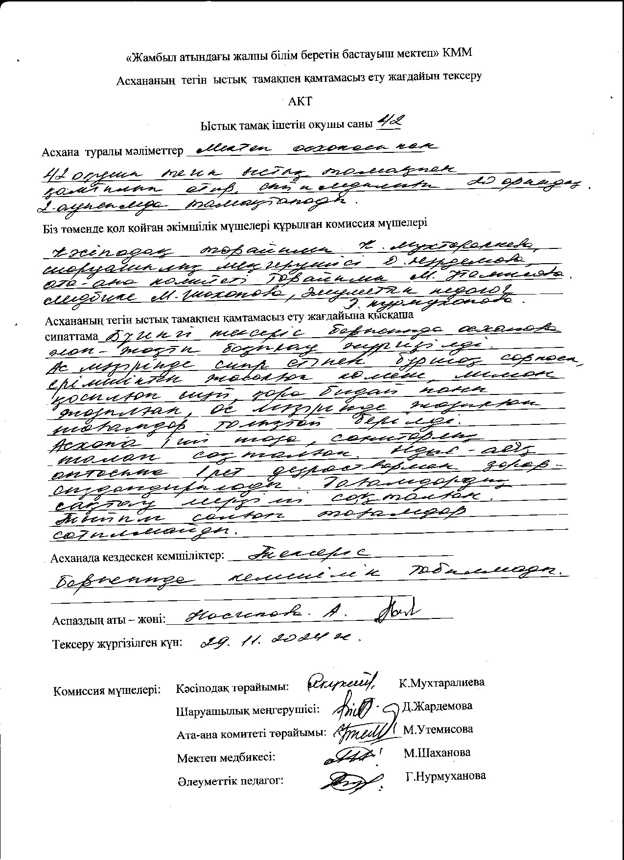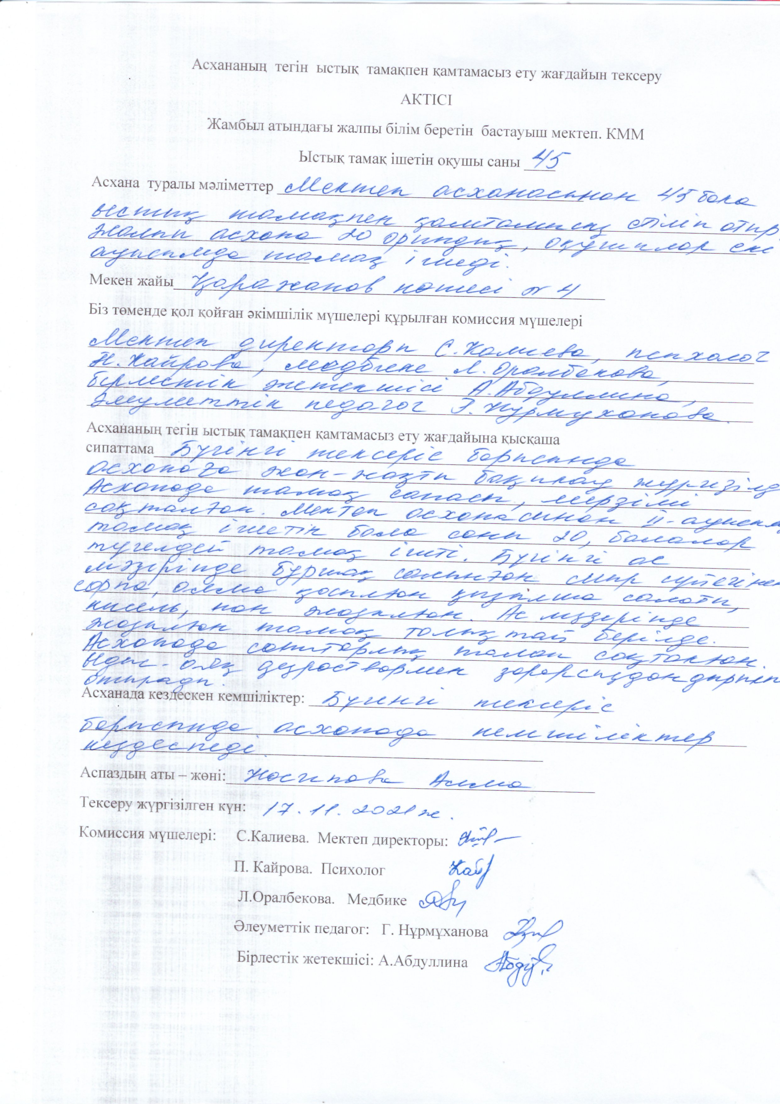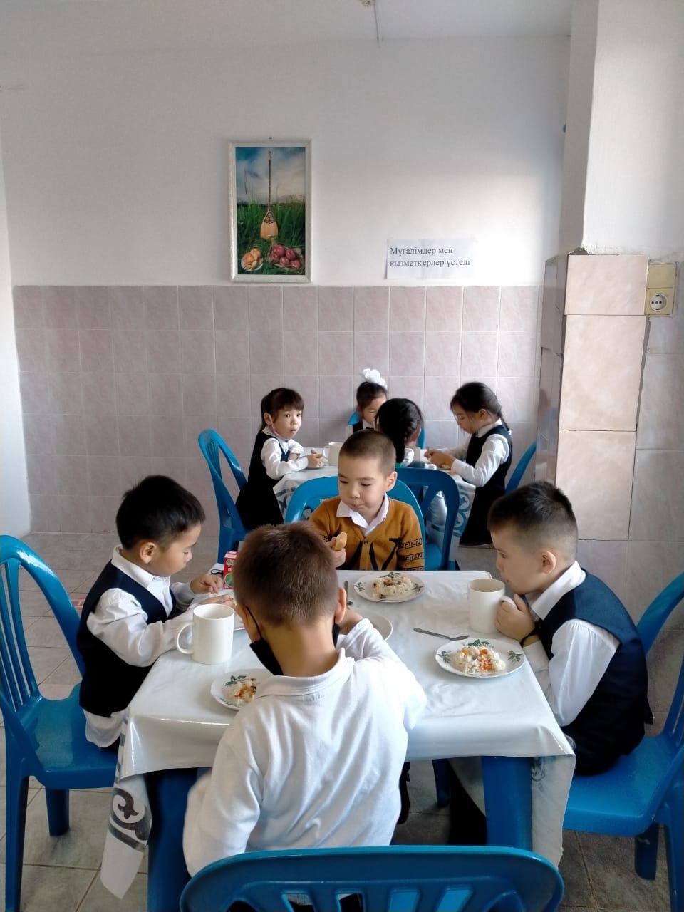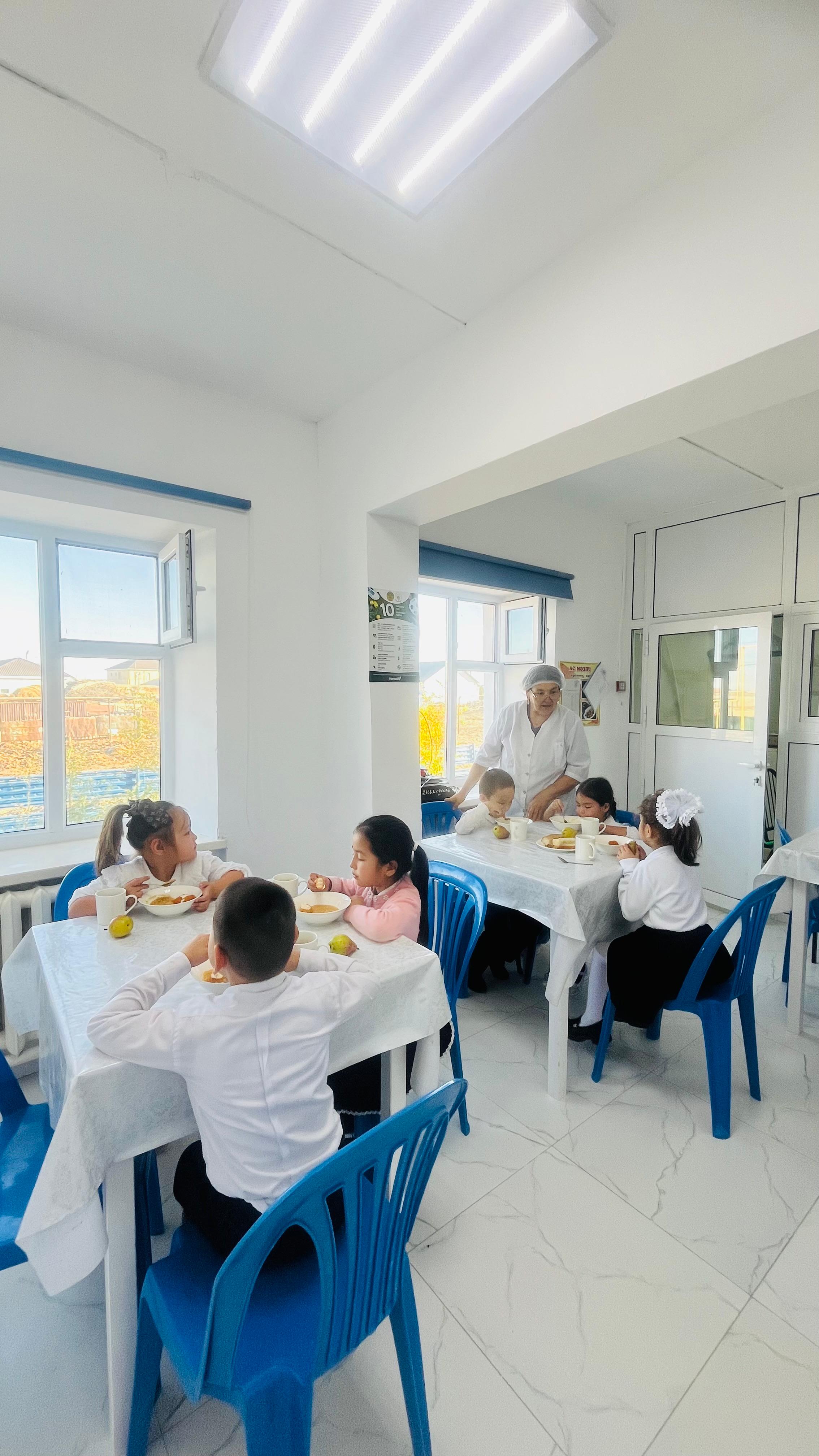 Биылғы 2019-2020 оқу жылында мектебімізде 1-4 сынып аралығында 54 оқушы, мектепке дейінгі топтарда 15 тәрбиеленуші тәрбиеленіп білім алуда. Жалпы саны 69 1-4 сынып оқушылары соны мен қатар әлеуметтік жағдайы жетім, жартылай жетім , аз қамтылған оқушылар тегін ыстық тамақпен қамтылып отыр. Екі ауысымда мектеп асханасынан ыстық тамақ беріледі. І-кезеңде – 27 оқушы (оның төртеуі әлеуметтік жағдайдағы балалар) ІІ - кезеңде - 27 оқушы (оның алтауы әлеуметтік жағдайдағы балалар) Мектеп асханасына жеке кәсіпкер ИП «Жанель» Нурғалиев Бауыржан тағамның уақытында келуін, азық-түлік өнімдерін тасымалдау үшін Toyota Hilux Pick-up- 489KFA06 автокөлігімен қамтамасыз етіледі. Асхана аспазшысы Насипова Алма медициналық тексеруден толық өткен. Асханада күнделікті ас мәзірі жасақталып бекітіліп отырады. Әлеуметтік жағдайдағы оқушылар саны 10 Асханаға ас мәзірі бойынша ыстық тағаммен қамтылуын қадағалайтын комиссия құрылып әр айдың 20 -да тексеріс жүргізіліп отырады.