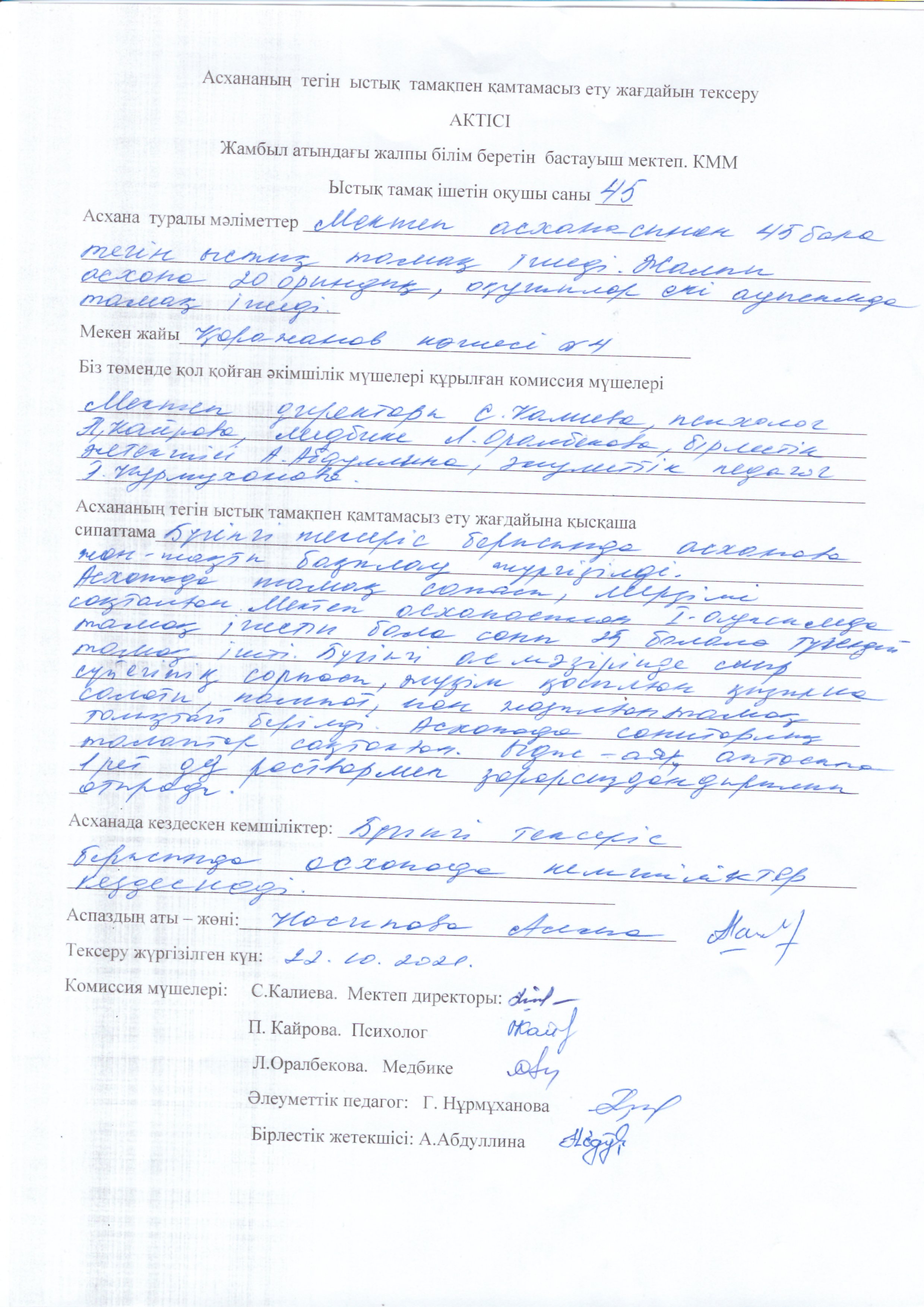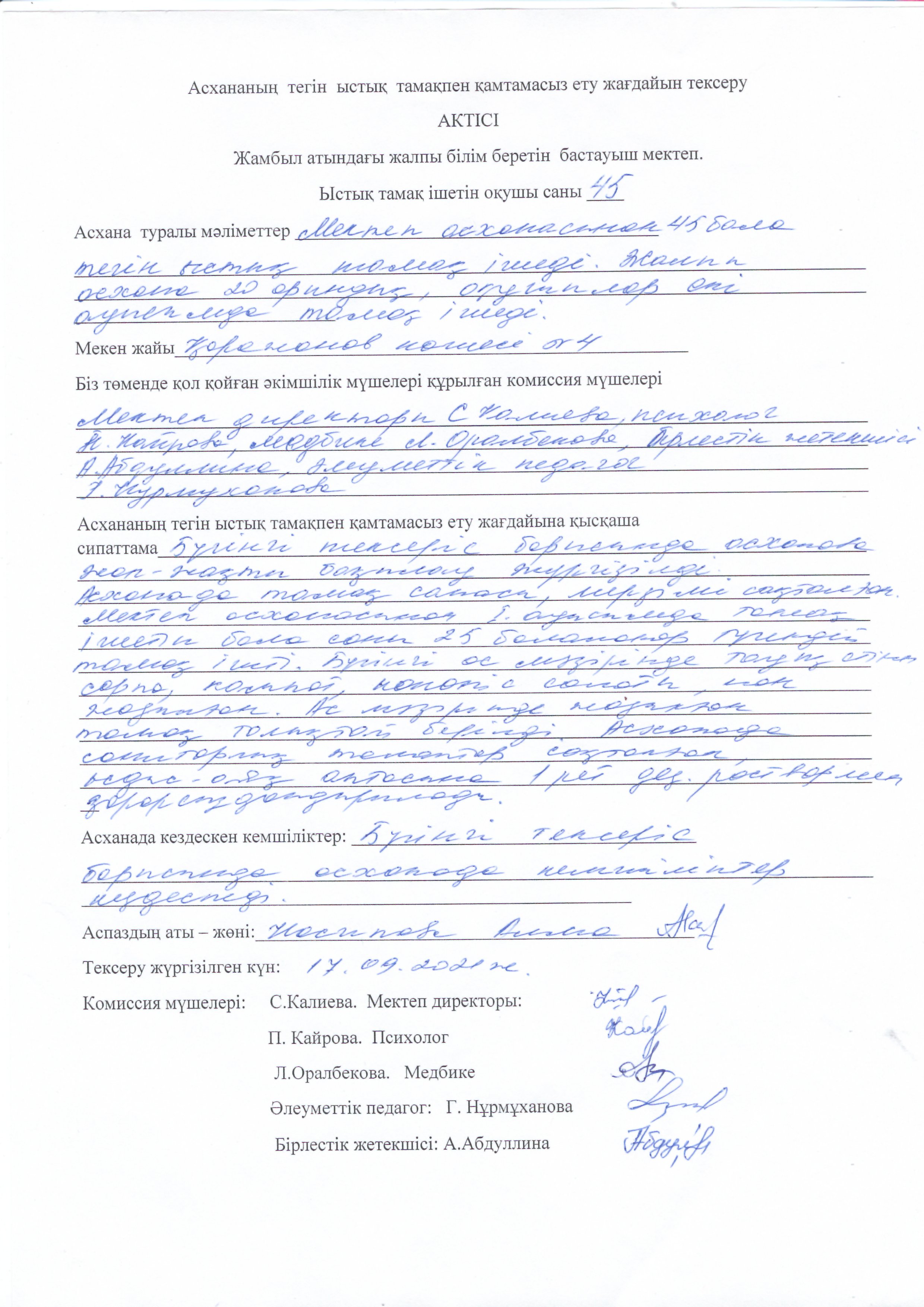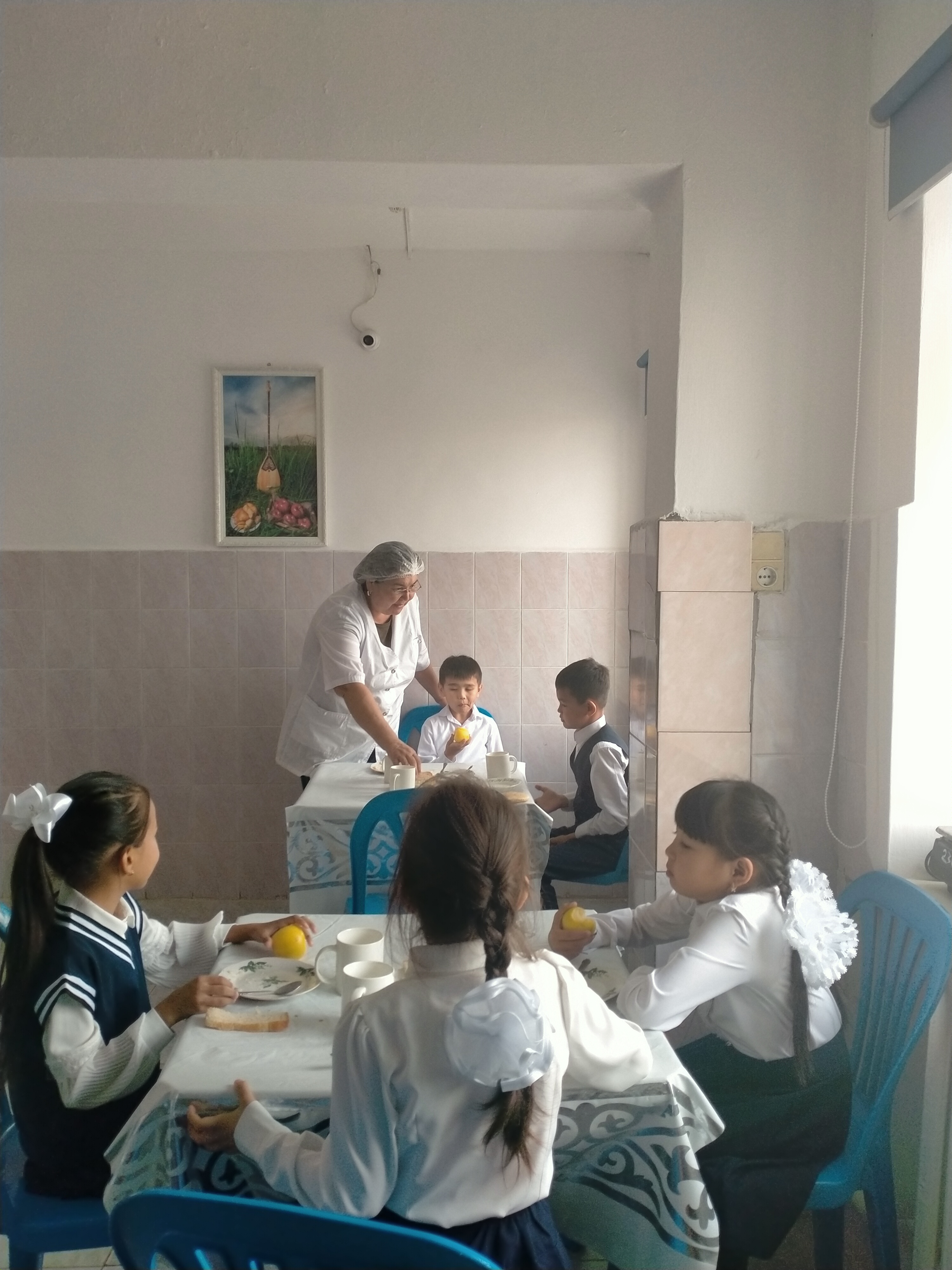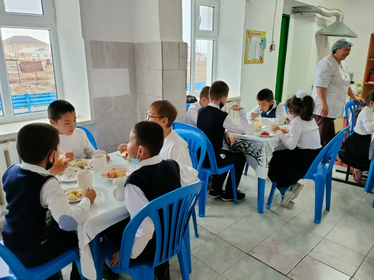 Биылғы 2019-2020 оқу жылында мектебімізде 1-4 сынып аралығында 54 оқушы, мектепке дейінгі топтарда 15 тәрбиеленуші тәрбиеленіп білім алуда. Жалпы саны 69 1-4 сынып оқушылары соны мен қатар әлеуметтік жағдайы жетім, жартылай жетім , аз қамтылған оқушылар тегін ыстық тамақпен қамтылып отыр. Екі ауысымда мектеп асханасынан ыстық тамақ беріледі. І-кезеңде – 27 оқушы (оның төртеуі әлеуметтік жағдайдағы балалар) ІІ - кезеңде - 27 оқушы (оның алтауы әлеуметтік жағдайдағы балалар) Мектеп асханасына жеке кәсіпкер ИП «Жанель» Нурғалиев Бауыржан тағамның уақытында келуін, азық-түлік өнімдерін тасымалдау үшін Toyota Hilux Pick-up- 489KFA06 автокөлігімен қамтамасыз етіледі. Асхана аспазшысы Насипова Алма медициналық тексеруден толық өткен. Асханада күнделікті ас мәзірі жасақталып бекітіліп отырады. Әлеуметтік жағдайдағы оқушылар саны 10 Асханаға ас мәзірі бойынша ыстық тағаммен қамтылуын қадағалайтын комиссия құрылып әр айдың 20 -да тексеріс жүргізіліп отырады.