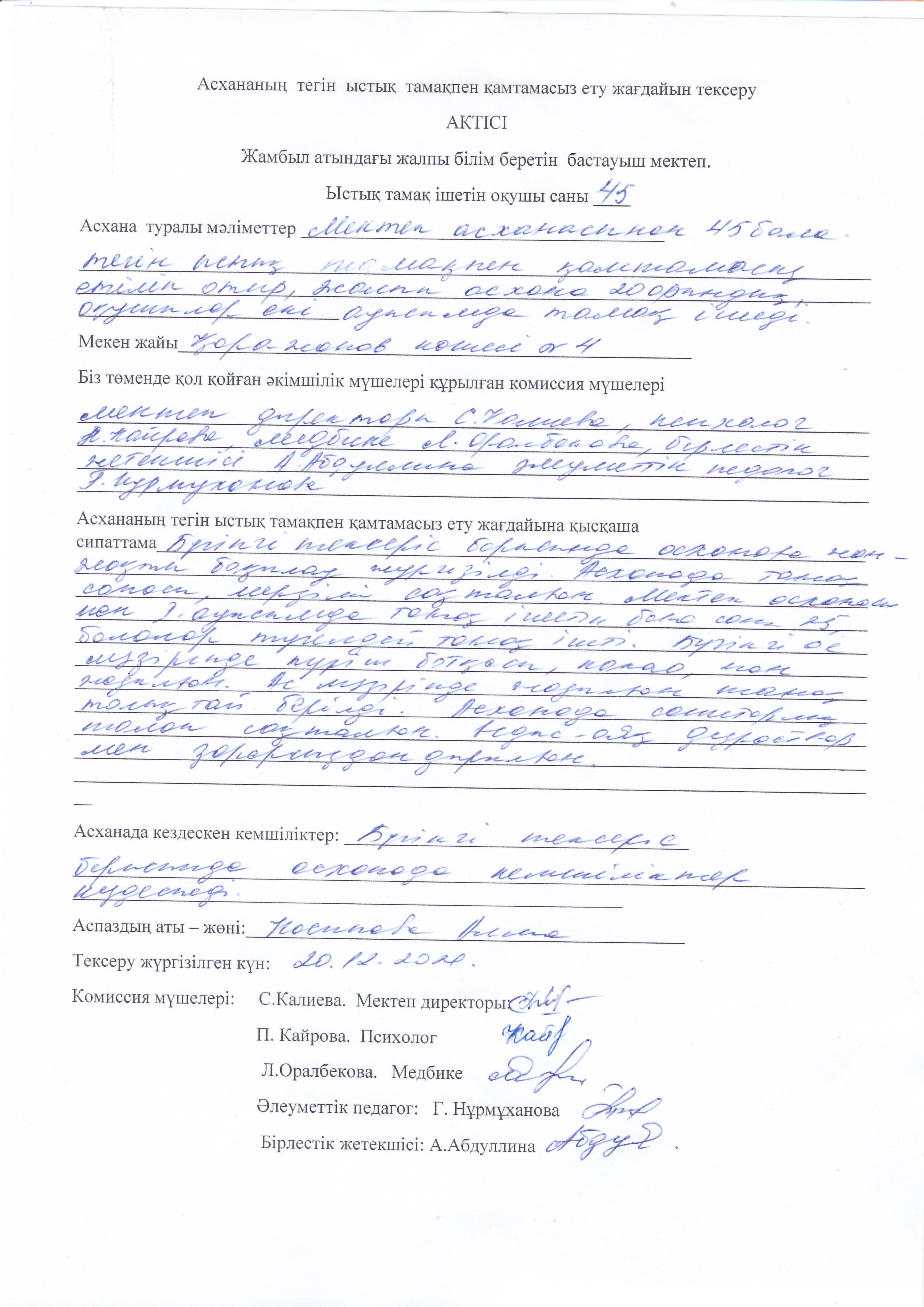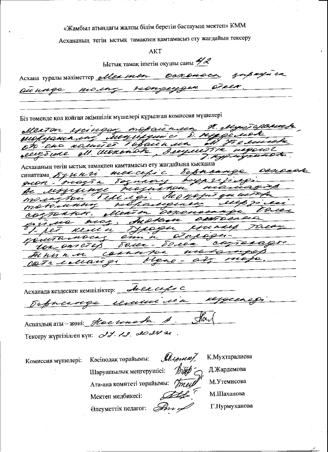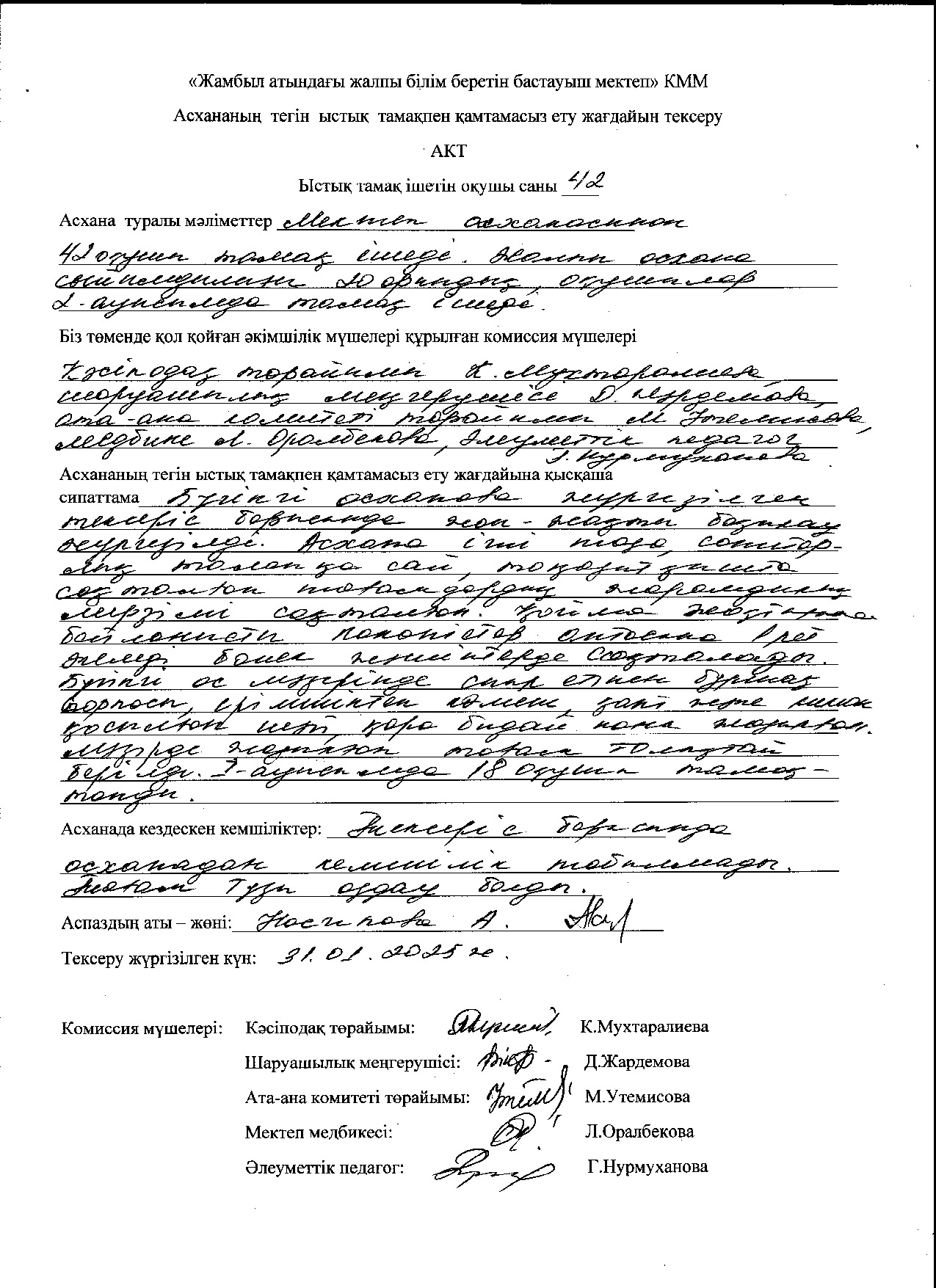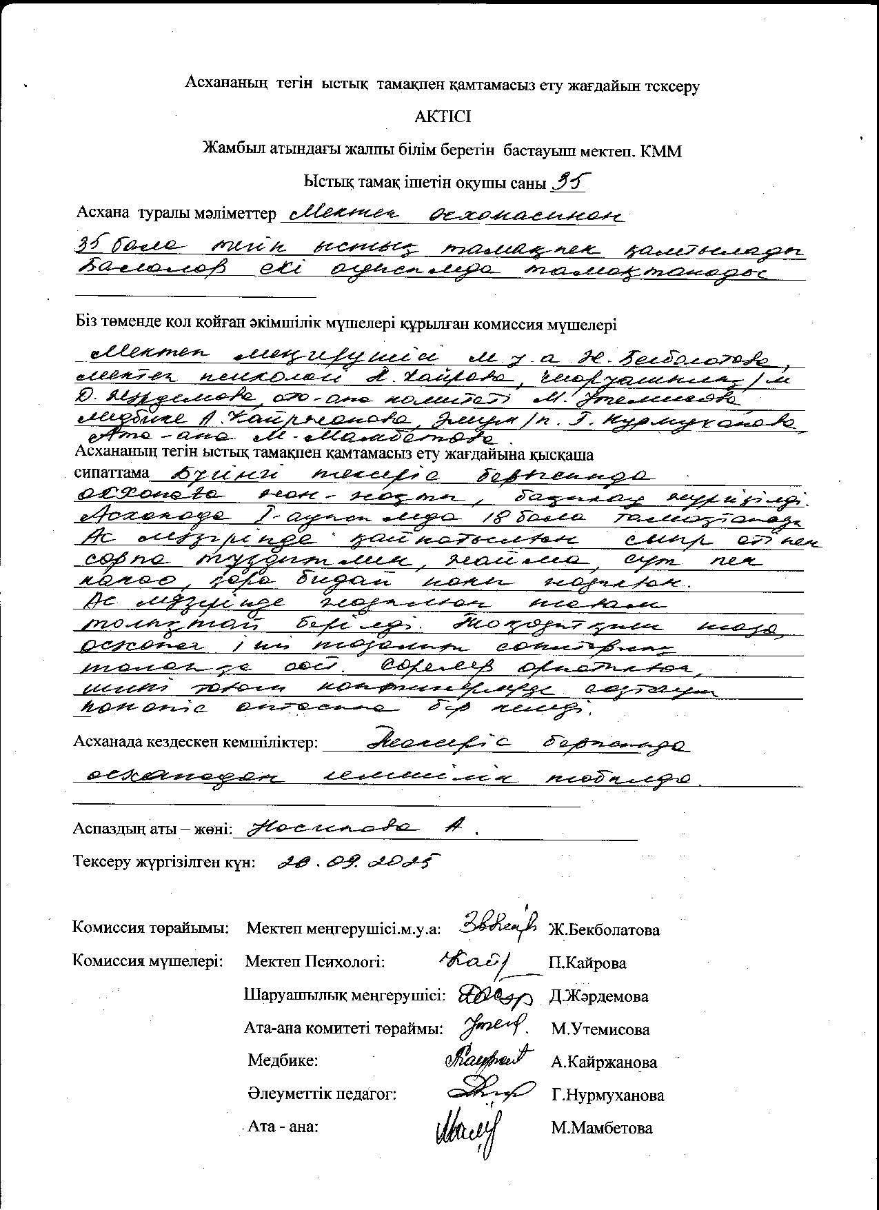 Биылғы 2019-2020 оқу жылында мектебімізде 1-4 сынып аралығында 54 оқушы, мектепке дейінгі топтарда 15 тәрбиеленуші тәрбиеленіп білім алуда. Жалпы саны 69 1-4 сынып оқушылары соны мен қатар әлеуметтік жағдайы жетім, жартылай жетім , аз қамтылған оқушылар тегін ыстық тамақпен қамтылып отыр. Екі ауысымда мектеп асханасынан ыстық тамақ беріледі. І-кезеңде – 27 оқушы (оның төртеуі әлеуметтік жағдайдағы балалар) ІІ - кезеңде - 27 оқушы (оның алтауы әлеуметтік жағдайдағы балалар) Мектеп асханасына жеке кәсіпкер ИП «Жанель» Нурғалиев Бауыржан тағамның уақытында келуін, азық-түлік өнімдерін тасымалдау үшін Toyota Hilux Pick-up- 489KFA06 автокөлігімен қамтамасыз етіледі. Асхана аспазшысы Насипова Алма медициналық тексеруден толық өткен. Асханада күнделікті ас мәзірі жасақталып бекітіліп отырады. Әлеуметтік жағдайдағы оқушылар саны 10 Асханаға ас мәзірі бойынша ыстық тағаммен қамтылуын қадағалайтын комиссия құрылып әр айдың 20 -да тексеріс жүргізіліп отырады.